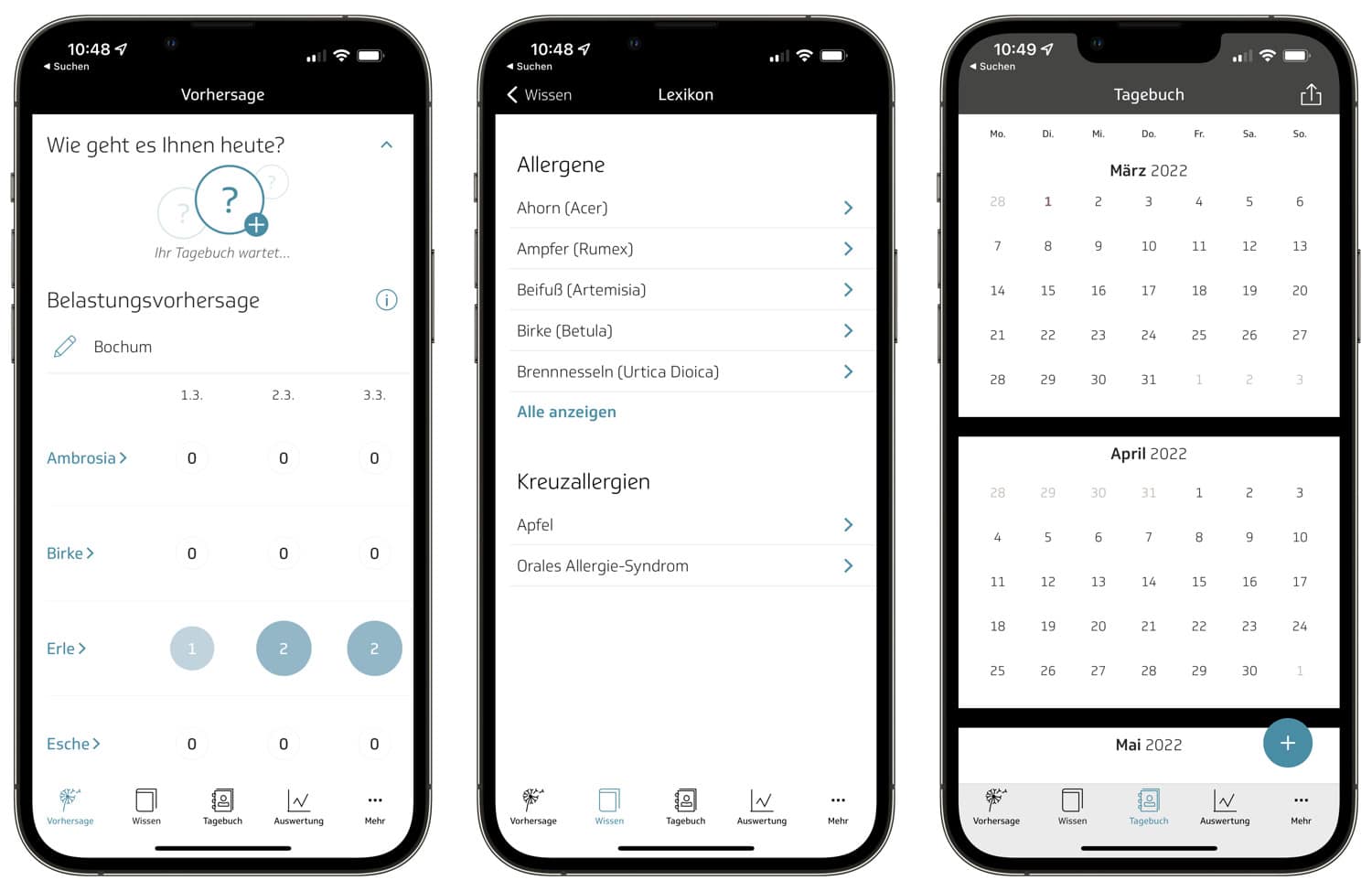 Die kostenlose iPhone- und Apple Watch-App der Techniker Krankenkasse bietet auf der Startseite die aktuelle Belastung durch Pollen an. Die optische Aufmachung ist etwas trist, hier würde etwas mehr Farbe den Überblick vereinfachen. Mit dabei ist auch ein Lexikon und ein Pollenflugkalender, ebenso kann man sein Befinden im Tagebuch festhalten. Wer möchte, kann sich auch bei Pollenflug benachrichtigen lassen, wobei man selbst die entsprechenden Blüher bestimmen kann.