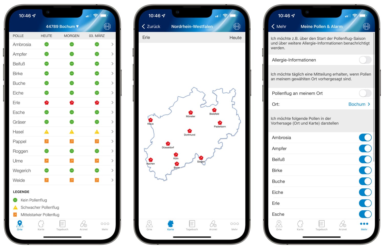 Der ratiopharm Pollen-Radar ist für iPhone und iPad verfügbar und zeigt auf der Startseite ebenfalls alle wichtigen Pollen und deren Belastung für den aktuellen Standort an. Mit Zahlen wird hier die entsprechende Bestattung angezeigt. Hinzu kommt eine Karte und ein Tagebuch, ebenso gibt es hilfreiche Tipps und ratiopharm-Arznei-Empfehlungen. Optisch auch voll in Ordnung.