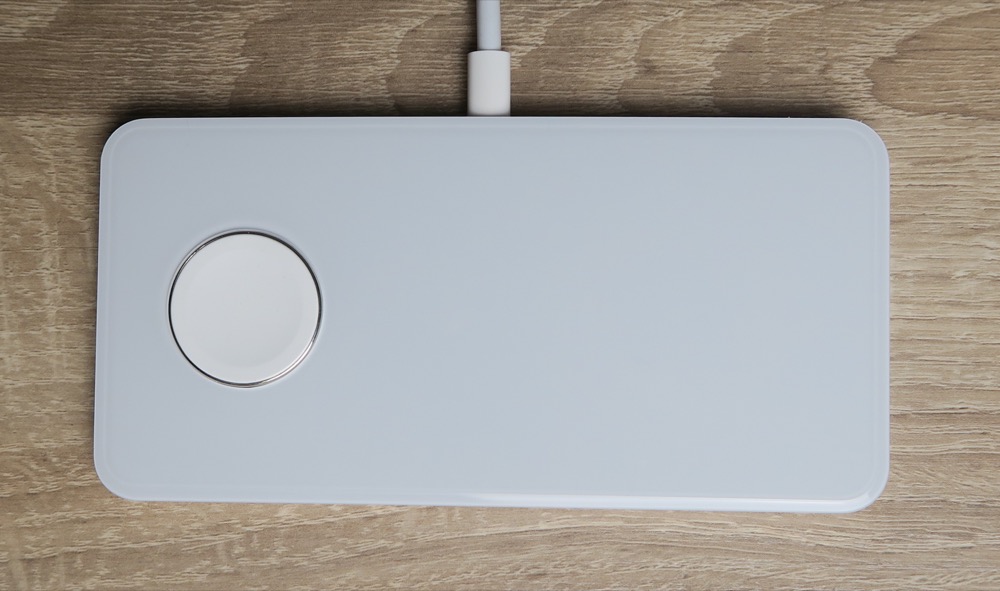 Die Ladeplatte ist kompakt und misst 13,7 x 6,8 x 0,8 Zentimeter und wiegt 159 Gramm. Auf der Rückseite befinden sich vier kleine Gummistopper, die das Ladegerät an Ort und Stelle halten. Das Aufladen des iPhones erfolgt mit 7,5 Watt, möglich sind bis zu 10 Watt. Die Apple Watch wird mit 2 Watt aufgeladen.