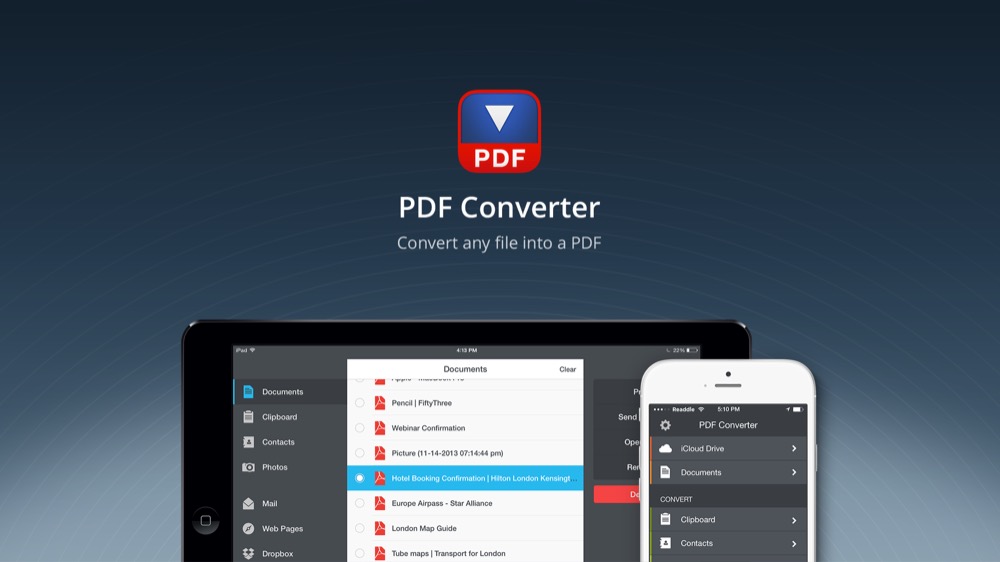 Die von Readdle zur Verfügung gestellte Applikation PDF Converter (App Store-Link) wurde ebenfalls im Preis halbiert. Der PDF Converter wird seinem Namen gerecht. Mit der Applikation könnt ihr aus jeder Datei ein PDF-Dokument erstellen. So könnt ihr mit wenigen Klicks Word-, Excel-, PowerPoint- und iWork-Dokumente umwandeln, auch Webseiten, Fotos und Inhalte aus der Zwischenablage können ebenfalls in wenigen Arbeitsschritten in PDF-Dateien konvertiert werden.