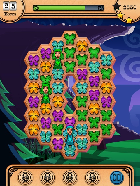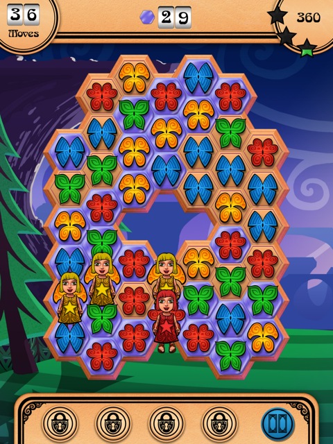 Das wirklich hübsch aufgemachte Puzzles and Pixies ist ein klassisches Match3-Game, bei dem der Spieler in diesem Fall versuchen muss, über Wischbewegungen mindestens drei oder mehr gleichfarbige Schmetterlinge zu verbinden, um diese dann vom Screen zu löschen. Gelingt eine Combo aus fünf Elementen, wird eine Fee (engl. „pixie“) freigeschaltet, die, sobald mit gleichfarbigen Schmetterlingen verbunden, eine kleine Explosion auf dem Spielbrett auslöst. Über eine siebenfache Kombination aktiviert man eine Fee, die vertikale Feuerstöße produziert und so gleich so einige Steine löscht – und damit für einige Punkte sorgt.