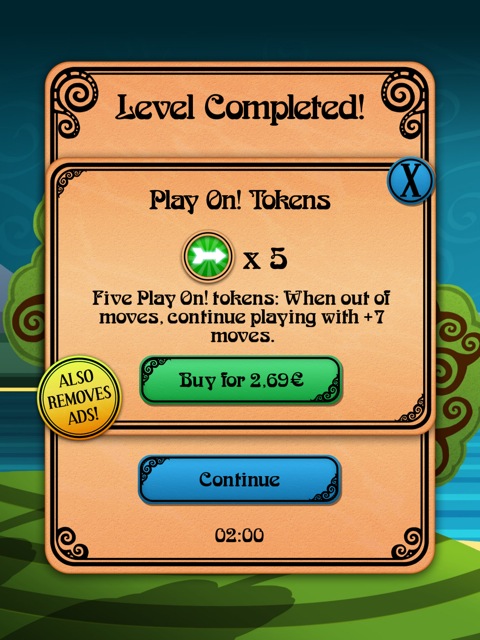 Insgesamt gibt es in Puzzles and Pixies über 200 verschiedene Level, deren Schwierigkeitsgrad stetig ansteigt und auch nach kurzer Zeit mit eingeblendeten Werbebannern versehen sind. Letztere tauchen zwischen den Leveln auf, können aber wenigstens mit einem kleinen „x“-Button sofort weggeklickt werden. Möchte man diese dauerhaft entfernen und auch weitere Versuche erlangen, wenn keine weiteren Züge mehr möglich sind, ist ein In-App-Kauf von 2,69 Euro Pflicht. Die Developer betonen allerdings in der App-Beschreibung, dass sich das gesamte Spiel auch ohne Zukäufe absolvieren lässt.