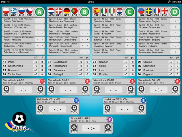 QuickEuro2012 (App Store-Link) ist ein eben solcher Spielplan, den man jetzt für 79 Cent auf das iPad laden kann. Die 1,8 MB große App ist Retina-optimiert, bietet aber wirklich nur den Spielplan mit den aktuellen Ergebnissen und keinen weiteren Informationen an.