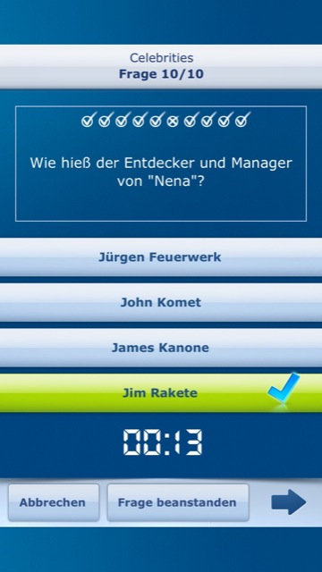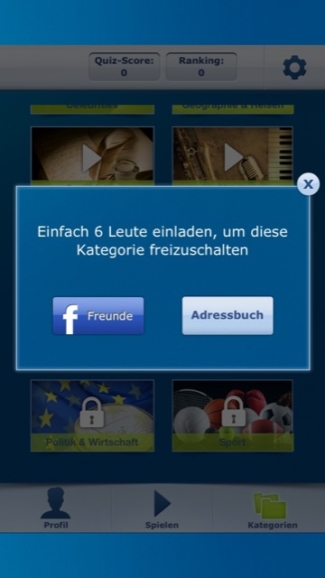 Aber auch ohne Freunde und Registrierung lässt sich Quiz Cosmos nutzen. Insgesamt stehen sechs verschiedene Kategorien bereit, in denen man sich in Quizrunden à 10 Fragen beweisen kann. Ausgewählt werden kann zwischen Allgemeinwissen, den 2000er Jahren, Celebrities, Geografie & Reisen, Geschichte und Musik. In der App gibt es noch weitere sechs Themengebiete, die allerdings nur Nutzern mit Account vorbehalten sind – und die dann auch noch pro Kategorie sechs Facebook-Freunde einladen müssen. Leider gehören zu diesen Themengebieten auch Klassiker wie Politik, Natur und Sport, in die es sich sicher gelohnt hätte hineinzuschauen. Wer allerdings seine gesamte Kontaktliste nicht vollspammen möchte, muss auf diese Features wohl verzichten.