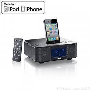Außerdem gibt es das iTeufel Radio v2 (Link zum Shop), das ist ein Tischradio, Radiowecker und ein Sounddock in einem. Es handelt sich um ein 50-Watt Tischradio mit hoher Klangqualität. Auch hier kann man iPhone oder iPod Touch einfach mit dem Dock-Connector verbinden, ein Wecker ist auch integriert. Das iTeufel Radio v2 verfügt über zwei Breitband-Lautsprecher die einen echten Stereo-Ton erzeugen. Auch hier gibt es im Gehäuseboden einen Subwoofer. Der Originalpreis liegt bei 199 Euro, jetzt zahlt man nur 99,99 Euro.
