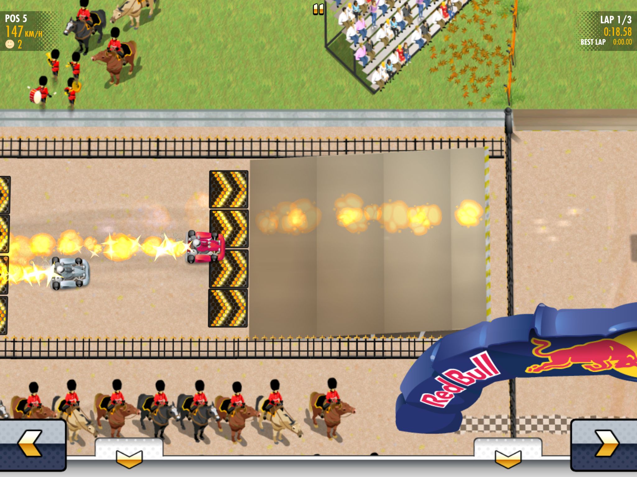 Im Mittelpunkt von Red Bull Kart Fighter 3 steht der Karriere-Modus, in dem man nach und nach mit immer mehr Strecken und Karts in Kontakt kommt. Die Freischaltung erfolgt hier über den Gewinn von Sternen – dieser ist zum Teil aber an den Einsatz von Power-Ups gebunden, die man wiederum mit gesammelten Münzen kaufen muss. Dumm nur, dass man selbst für einen Sieg weniger Münzen bekommt, als ein Power-Up kostet. Aber zum Glück gibt es ja In-App-Käufe.