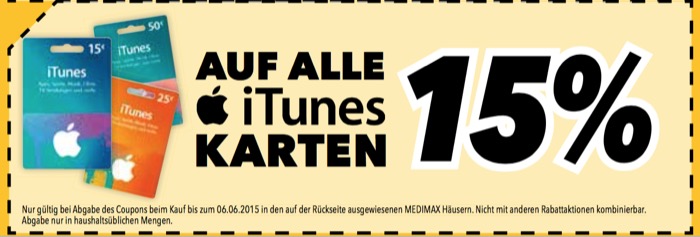 Etwas verzwickter sieht die Sache bei Medimax aus. Dort hat die Aktion zwar schon heute gestartet und läuft ebenfalls bis nächste Woche Samstag, allerdings scheinen nicht alle Märkte teilzunehmen. Am besten schaut ihr direkt in der Filiale in den Prospekt, dort sollte unten auf der ersten Seite der folgende Coupon zu finden sein. Alternativ könnt ihr auch auf der Medimax-Webseite nachschauen, dort bieten aber nicht alle Märkte eine PDF-Version der Werbung an. Wichtig: Auch bei Medimax gibt es 15 Prozent Rabatt auf alle iTunes-Karten, laut Teilnahmebedingungen muss man allerdings den Coupon vorlegen.
