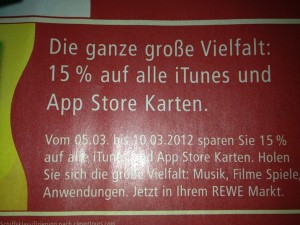 Den Anfang machen REWE und Kaufpark. Bei beiden Supermärkten gibt es in dieser Woche 15 Prozent Rabatt auf alle iTunes-Karten. Das Angebot war ja schon länger von uns angekündigt, der Rabatt wird wie immer direkt an der Kasse abgezogen.