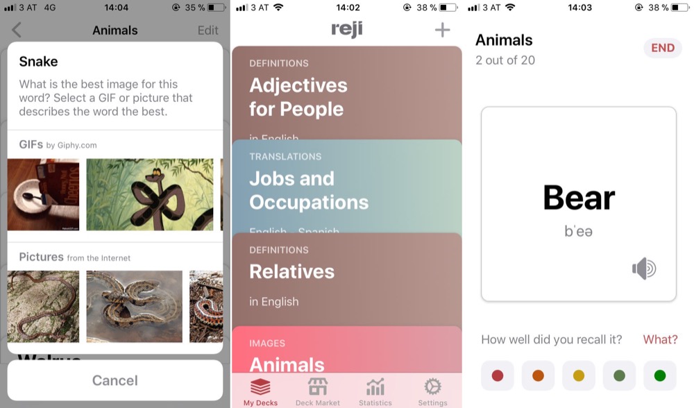 Mit Reji lassen sich auf bequeme Weise sogenannte „Decks“ mit Vokabelthemen erstellen, um so Wörter einer Fremdsprache besser erlernen zu können. Das Besondere daran: Die Lernkarten für die erstellten Themendecks werden von der App mittels einer Übersetzungs-Funktion automatisch erstellt. Um die erstellten Vokabelkarten, die auch Fotos und Notizen beinhalten können, abzufragen, sind mindestens vier vorhandene Karten notwendig.