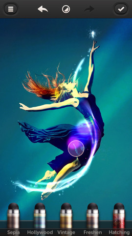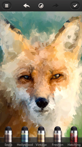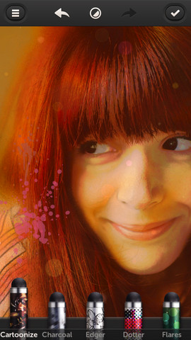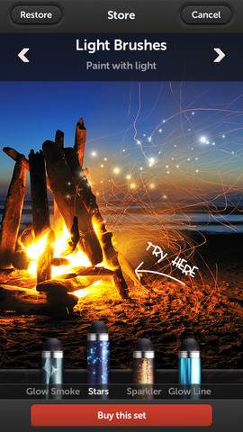 Die Bearbeitung ist wirklich simpel. Am unteren Displayrand steht eine Auswahl an Pinsel bereit. Durch einen Klick wird er aktiviert und mit einfachen Fingerwischs kann man die entsprechenden Effekte auf das Foto anwenden. Durch den kostenlose Download steht anfangs allerdings nur eine kleine Auswahl zur Verfügung, durch In-App-Käufe kann man die Palette erweitern, für 4,49 Euro gibt es das komplette Paket.