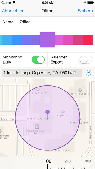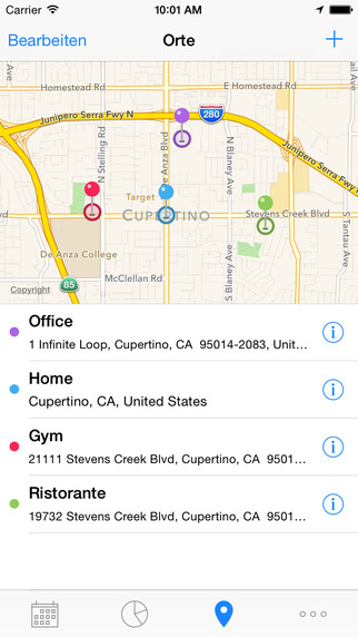 In Rewind legt man nach dem Start einfach mehrere Orte an, die einfach per Adresseingabe oder die Ortungsfunktion des iPhones gesucht werden können. Zuhause, Büro, Kunde A, B oder C, Fitnessstudio, Universität und alle Orte, an denen ihr euch häufiger aufhaltet.