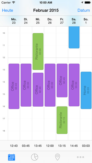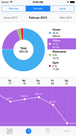 Rewind nutzt danach eine kontinuierliche Ortung, um eine schicke Tabelle zu erstellen. Das belastet zwar den Akku des iPhones, dafür bekommt ihr aber eine sehr gute Übersicht darüber, wann und wie lange ihr euch an einem Ort aufgehalten habt, ohne Daten manuell eintragen zu müssen. Neben mehreren internen Statistiken als Kuchendiagramm und Graph können sämtliche Daten aus Rewind auch in unterschiedlichen Tabelle zur Weiterverarbeitung am Computer exportiert werden.