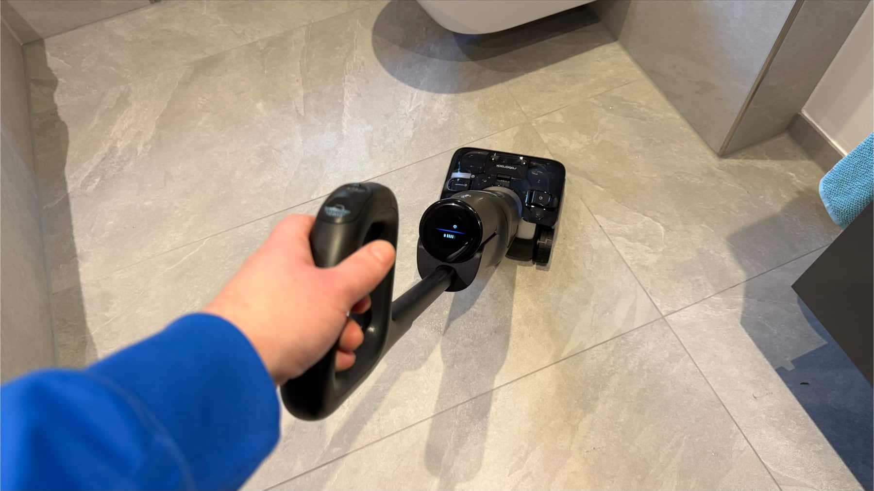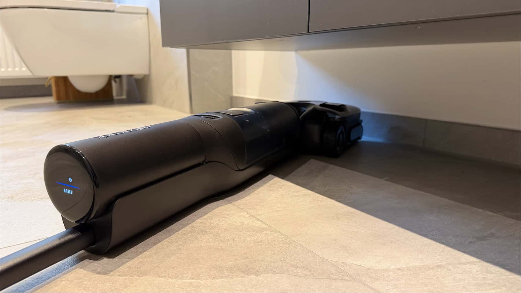 Mit der Handhabung bin ich sehr zufrieden, denn die motorisierten Räder, die sich sogar per App feinjustieren lassen, machen die Bewegung mühelos. Der Sauger gleitet über den Boden und verstärkt die Vor- und Zurückbewegung, sodass ich keine Kraft aufwenden muss. Darüber hinaus ist der Roborock F25 Ace Pro wendig und lässt sich auch an Kanten oder Möbeln einfach manövrieren.