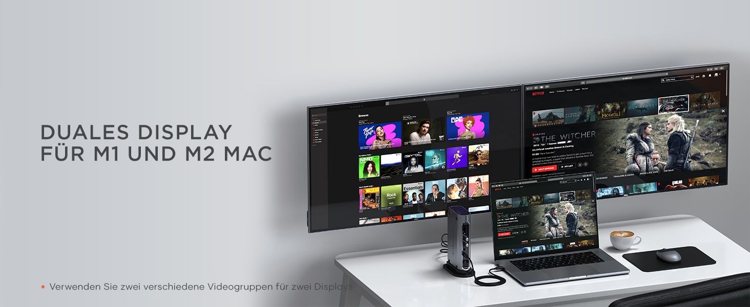 Habe noch ein „altes“ Intel MacBook und da betreibe ich 2x 4K-Monitore über eine Thunderbolt Docking Station (rechte Seite) und einen 3. 4K-Monitor an dem anderen Thunderbolt (linke Seite)