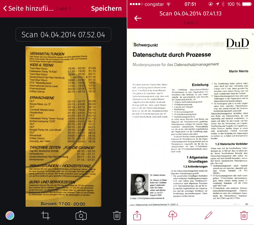 Ich denke der Vorteil gegenüber anderen Scan-Apps ist tatsächlich die Geschwindigkeit. Blatt ausrichten, App starten und neues Dokument anlegen, iPhone über Blatt halten und schwupp ist es gescannt.