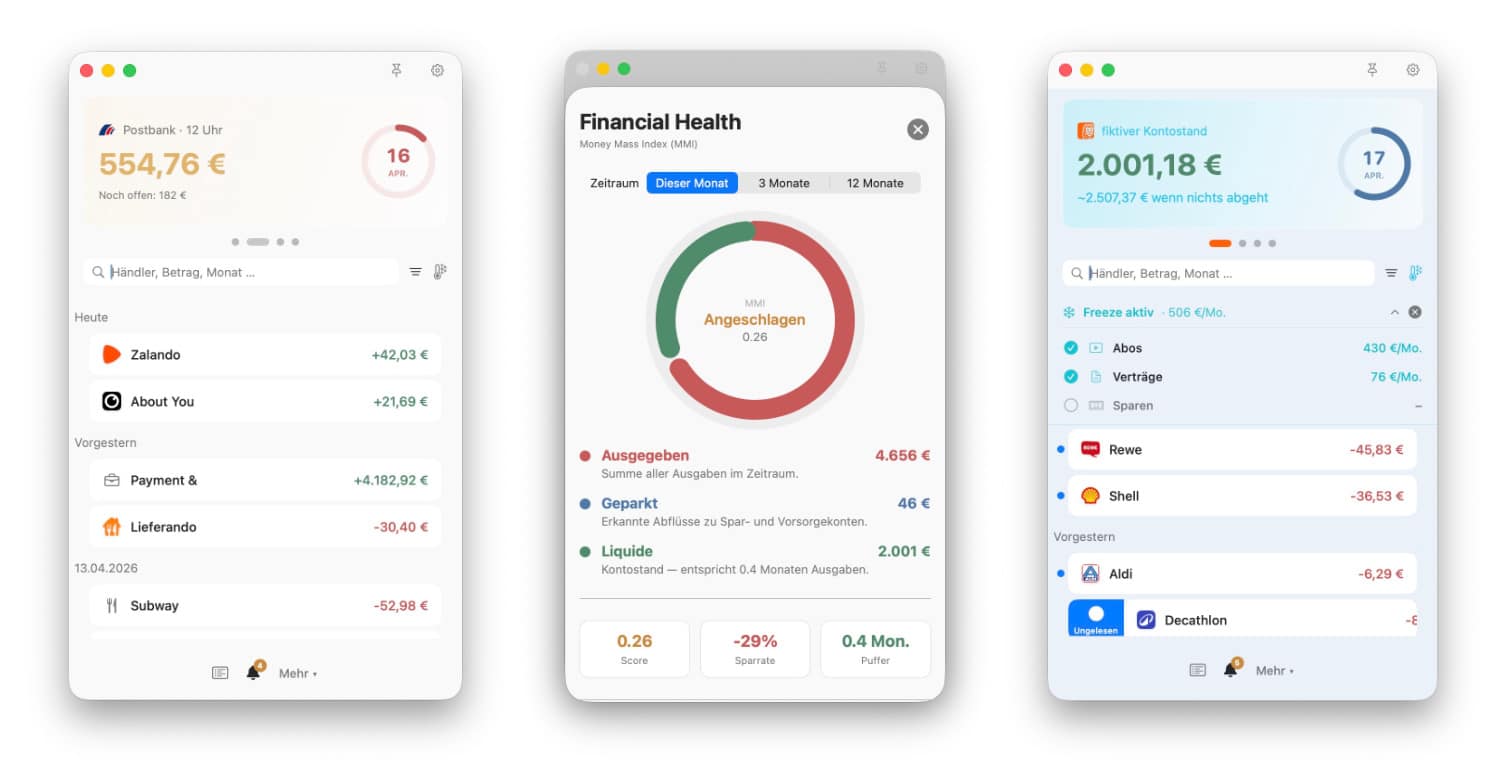 Ebenfalls neu ist der Freeze-Modus. Damit lässt sich sichtbar machen, wie sich pausierbare oder vermeidbare regelmäßige Ausgaben auf die persönliche Finanzlage auswirken würden. „Die Idee dahinter: Nicht nur zeigen, was da ist, sondern auch, wie viel Spielraum entstehen könnte“, erklärt dazu Entwickler Maik Klotz. Dazu kommt ein neuer Financial Health-Score, der die kurzfristige finanzielle Lage greifbarer machen soll, ohne die App in ein kompliziertes Finanztool zu verwandeln. Außerdem gibt es jetzt eine Erinnerungen-Integration in macOS. Buchungen lassen sich damit markieren und später wieder aufgreifen, zum Beispiel wenn man eine Abbuchung prüfen, reklamieren oder einfach nicht vergessen möchte.