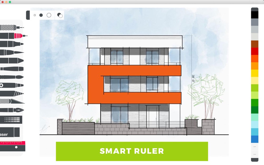 Wer schon die Version für iPhone und iPad nutzt, wird sich auch schnell in Sketches Pro zurechtfinden. Auf der linken Seite befinden sich die mehr als 20 verfügbaren Werkzeuge. Unter anderem gibt es einen Füllfederhalter, Feinmalstift, Filzstift, Wachsmalstift, Sprühfarbe, Muster, eine Schere, ein Radierer und einiges mehr. Besonders hervorheben sollte man die natürlichen Pinselstriche für Wasserfarben, die wirklich toll aussehen.