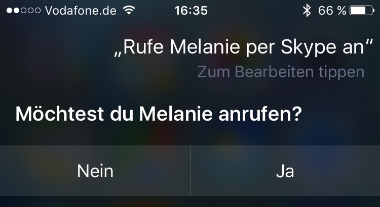 „Rufe Fabian per Skype an“, genügt und Siri startet nach kurzer Bestätigung den Anruf in der Skype-App – vorausgesetzt ihr seid online und angemeldet. Des Weiteren unterstützt Skype jetzt VoIP, so dass eingehende Anrufe auch direkt auf dem Sperrbildschirm beantwortet werden können – so wie man es bei herkömmlichen Anrufen kennt.