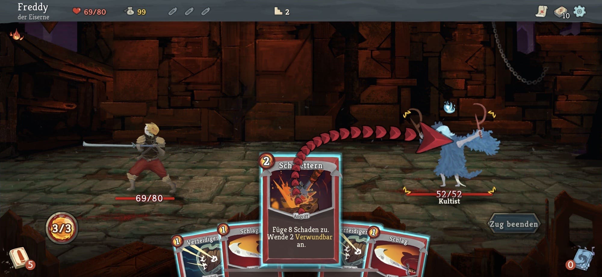 In rundenbasierten Kämpfen gilt es die Gegner zu eliminieren. Dafür stehen euch Spielkarten zur Verfügung, mit denen ihr Aktionen ausführen könnt. Das können Angriffskarten, aber auch Verteidigungskarten sein. Die Kombination ist relevant, zudem werden immer weitere Karten und Extras eingeführt. Gut: Alles wird erklärt, das Spiel begleitet euch am Anfang, um den Einsteig möglichst einfach zu gestalten.