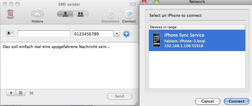 Der SMS Sender, den Mac-Benutzer kostenlos aus dem Mac App Store laden können, verspricht Abhilfe. Allerdings nur zusammen mit einer kostenpflichtigen App SMS client für das iPhone, die mit 1,59 Euro zu Buche schlägt. Beides installiert und gestartet, soll es eigentlich schon losgehen.