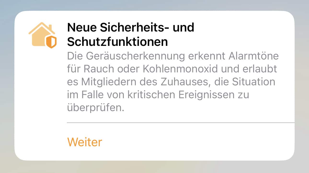 Optional wird auf dem Startbildschim in der Home-App auf die neue Sicherheits- und Schutzsfunktion mit einem großen Banner hingewiesen. Natürlich könnt ihr auch so die Geräuscherkennung für Alarmtöne aktivieren.