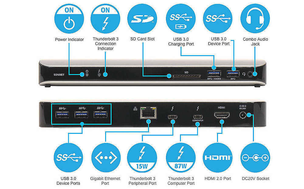 Das Sonnet Echo 11 Dock bietet zahlreiche Anschlüsse. Auf der Front gibt einen Power- und Thunderbolt 3-Aktivitätsindikator, ein SD-Karten-Slot, zwei USB 3.0-Anschlüsse sowie einen kombinierten Audio-Port. Auf der Rückseite gibt drei Mal USB 3.0, Gigabit Ethernet, Thunderbolt 3 mit 15W, Thunderbolt 3 mit 87 Watt, HDMI 2.0 sowie den Stromanschluss.