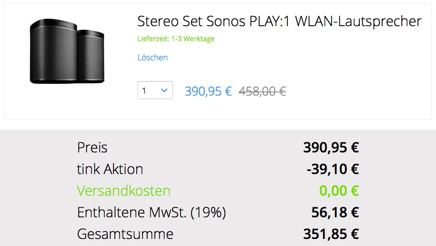 So kostet das Stereo-Set des Sonos Play 1, die beiden Lautsprecher lassen sich entweder zusammen in einem Raum oder in zwei getrennten Räumen betreiben, in den beiden verfügbaren Farben schwarz und weiß aktuell 390,95 Euro. Zieht man noch einmal 10 Prozent ab, macht das 351,85 Euro. Das macht pro Stück rund 175 Euro, im aktuellen Preisvergleich ist der Sonos Play 1 einzeln nicht unter 219 Euro erhältlich.