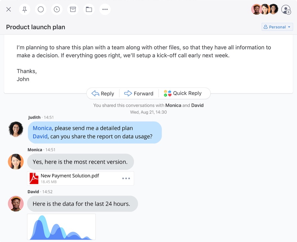 Private Diskussionen über Mails: Wollt ihr euch vor der Beantwortung einer Mail mit eurem Team austauschen? Kein Problem: Spark 2.0 bietet direkt innerhalb der E-Mail einen privaten Chat für einen Meinungsaustausch mit den Kollegen.