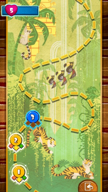 Auf diese Art und Weise werden Punkte generiert, die man benötigt, um eines der 100 zur Verfügung stehenden Level erfolgreich zu meistern. Während dieses Ziel in den ersten Leveln noch relativ einfach zu meistern ist, wird es im zunehmenden Spielverlauf immer schwieriger. Gesteuert wird der bewegliche Pfeil, der die Wurfrichtung des Tiers markiert, über einfache Wischgesten auf dem unteren Drittel des Bildschirms. So lässt sich Spin Safari praktischerweise mit nur einer Hand navigieren. Beachten sollte man allerdings auch, dass pro Level nur eine bestimmte Anzahl an Zügen zur Verfügung steht – hat man diese ausgereizt und die benötigten Punkte noch nicht erreicht, ist das Spiel vorbei.
