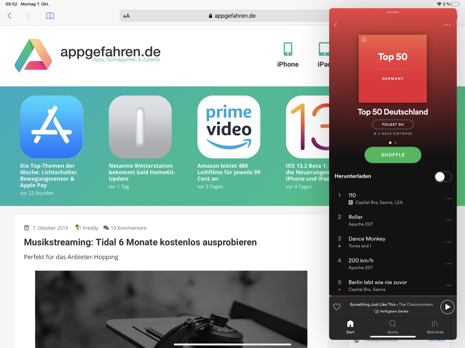 Habt ihr mitbekommen, dass die Spotify-App auf dem iPad Split View und Slide Over unterstützt? Seit Juli dieses Jahres könnt ihr auch Spotify neben einer anderen App anzeigen lassen oder als zusätzliches Fenster einblenden.