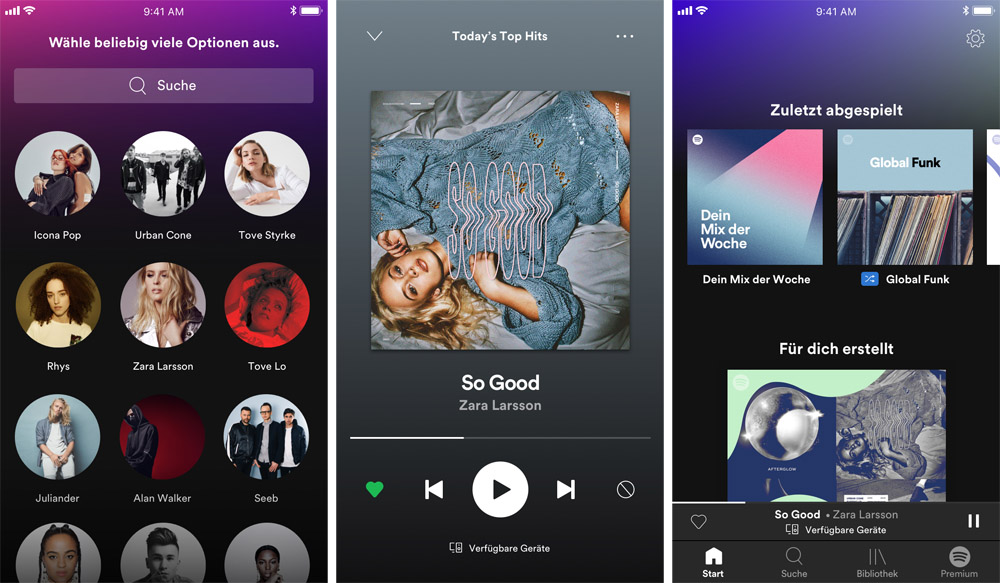 Meldet man sich als neuer Gratis-User in Spotify an, wird das Musikerlebnis ab sofort noch weiter individualisiert. Bei der Registrierung werden Nutzer nun nach Künstlern gefragt, die sie gerne hören. Der Auswahl entsprechend bietet der Streaming-Dienst dann personalisierte Playlists an, die auf der oben bereits erwähnten „Start“-Seite angezeigt werden. Um fortlaufend Feedback über favorisierte Musik abgeben zu können, bietet Spotify daher auch einen neuen „Gefällt mir“- bzw. „Gefällt mir nicht“-Button an, der sich in der Player-Ansicht finden lässt. Basierend darauf erhalten User noch bessere Musikempfehlungen und personalisierte Playlists. Tippt der Nutzer auf den Gefällt mir-Button, fügt er den Song außerdem direkt seiner Favoriten-Playlist hinzu.