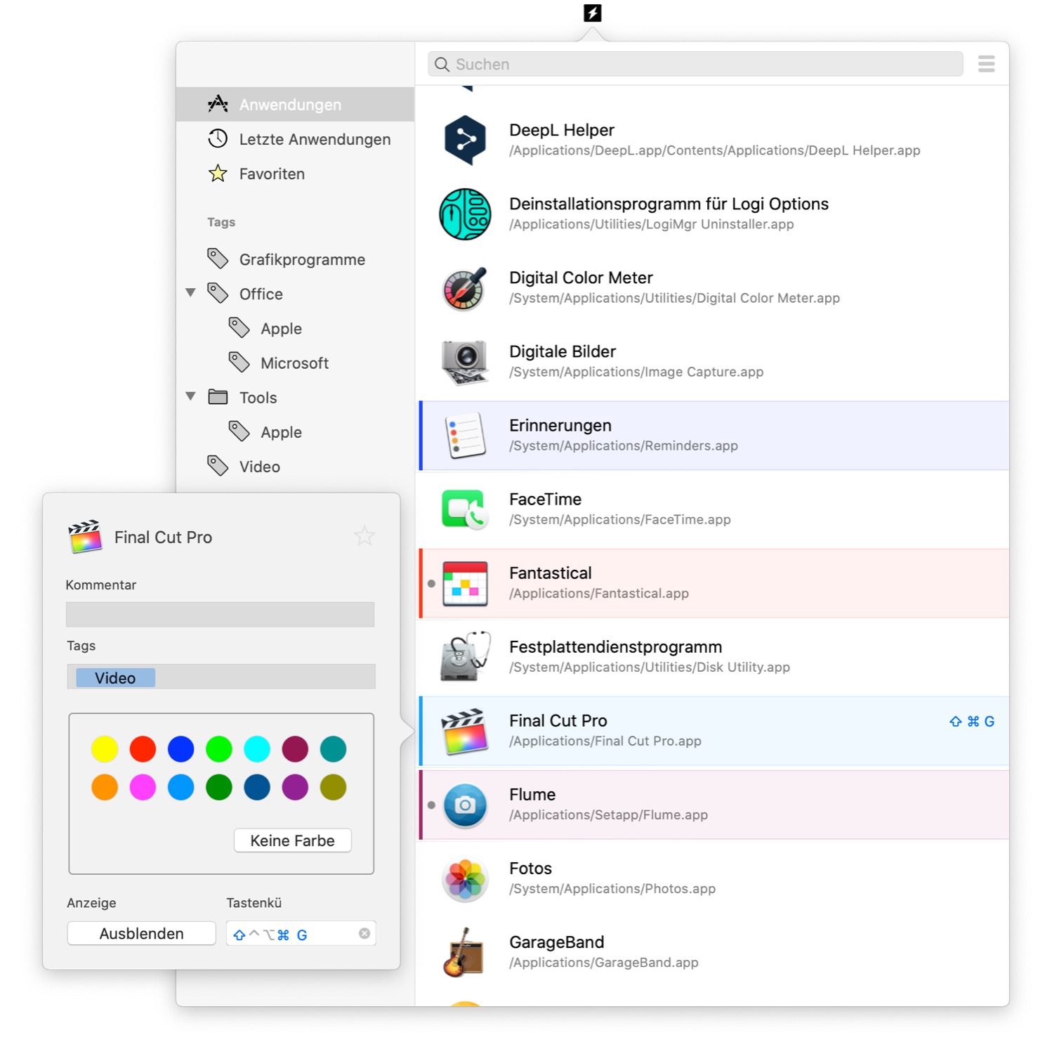 Unter anderem könnt ihr Anwendungen farblich hinterlegen und so zum Beispiel thematisch gleiche Apps markieren. Zudem könnt ihr Tags vergeben, die als Kategorien dienen. Wer mehrere Grafikprogramme hat, kann zum Beispiel das Tag „Grafik“ vergeben und findet dann alle Programme in dieser Kategorie wieder. Ebenso lässt sich ein Kommentar schreiben, der direkt unter dem Programm angezeigt wird.