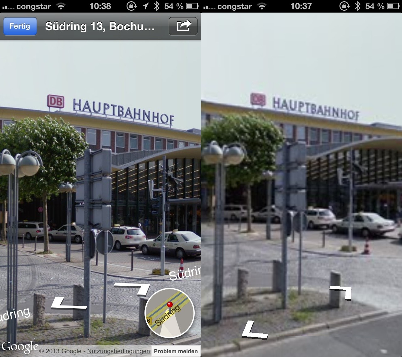 Im Gegensatz zur Vorversion setzt Streets nun übrigens komplett auf Kartenmaterial von Google – bisher wurden Vektorkarten und Satellitenbilder von Apple genutzt. Ein Vergleich zu Google Maps: Im Gegensatz zur „originalen“ App bietet Streets eine höhere Auflösung und Zoomtiefe. Um das zu verdeutlichen, habe ich einfach mal zwei Screenshots (Streets links, Street View rechts) nebeneinander gelegt und unten angehangen. Ich denke, dass der Unterschied deutlich erkennbar ist. Beide Bilder stammen von einem iPhone 5 und zeigen den Bochumer Hauptbahnhof aus der gleichen Perspektive.