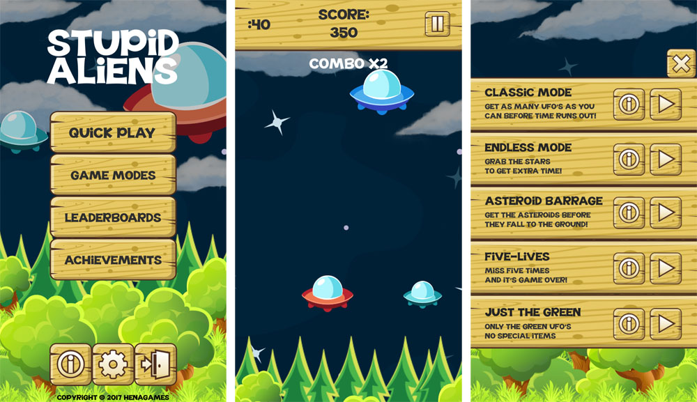 Gespielt werden kann in einem klassischen 45-Sekunden-Modus, in dem es heißt, so viele Aliens wie nur möglich auf dem Screen per Fingertipp zu treffen, sowie in einem Endlos-Modus, in dem man mit Sternen seine Zeitgutschrift wieder auffüllen kann, in einem Asteroiden-Modus, in dem verhindert werden muss, dass selbige zu Boden fallen, in einem Fünf-Leben-Modus, bei dem mehr als fünf Fehltreffer ein Ende der Partie bedeuten, und in einem grünen Modus, in dem nur die blitzschnellen grünen UFOs auf dem Bildschirm auftauchen.