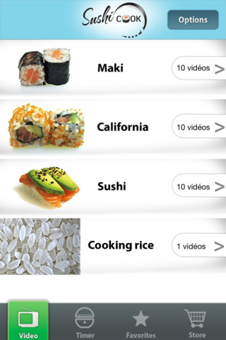 In Sushi Cook stehen momentan 31 verschiedene Videos im Mittelpunkt, die alle aus dem Internet gestreamt werden. Darin verrät der Sushi-Meister nicht nur, wie man den perfekten Reis kocht, sondern auch 30 Zubereitungsmöglichkeiten für leckeres Sushi. Die professionell erstellten Videos zeigen jeden notwendigen Arbeitsschritt und erklären ihn mit Untertiteln.
