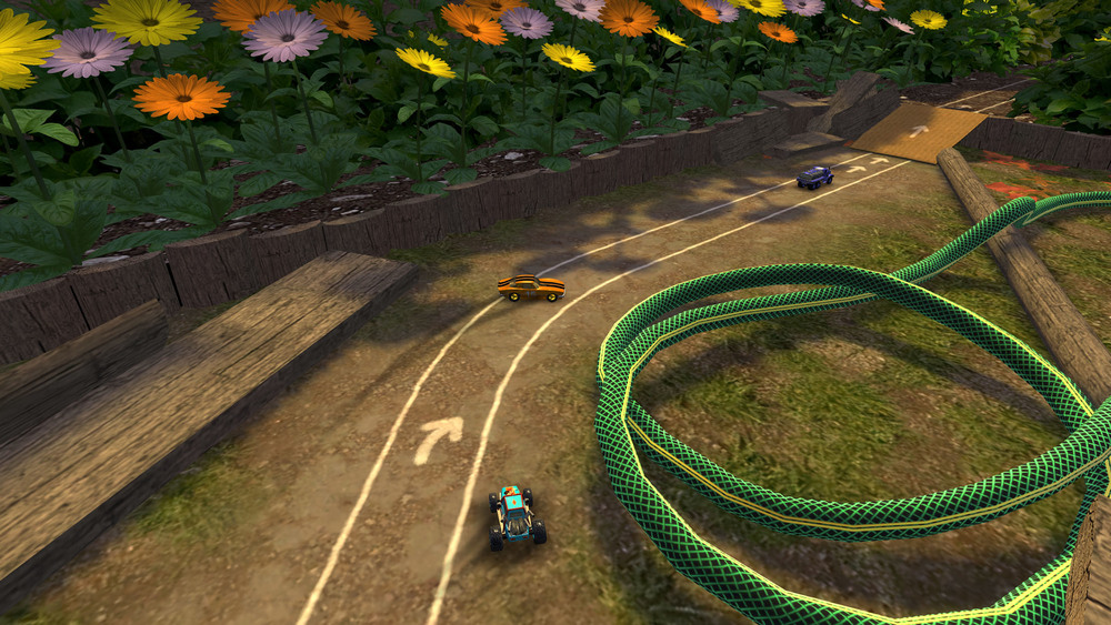 In wirklich schön gestalteten 3D-Welten fährt man im eigenen Wohnzimmer, auf dem Esstisch oder ums Haus rum. Pro Rennen gibt es mehrere Ziele zu erfüllen: Werde Erste, Schlage die Zeit, Sammle 3 Sterne und Zerstöre dein Auto. Es gilt immer zwei Runden zu fahren, bei denen ihr auch Power-Ups finden und einsetzen könnt. Sei es ein Geschwindigkeitsboost oder ein Feuerball als Abwehr.