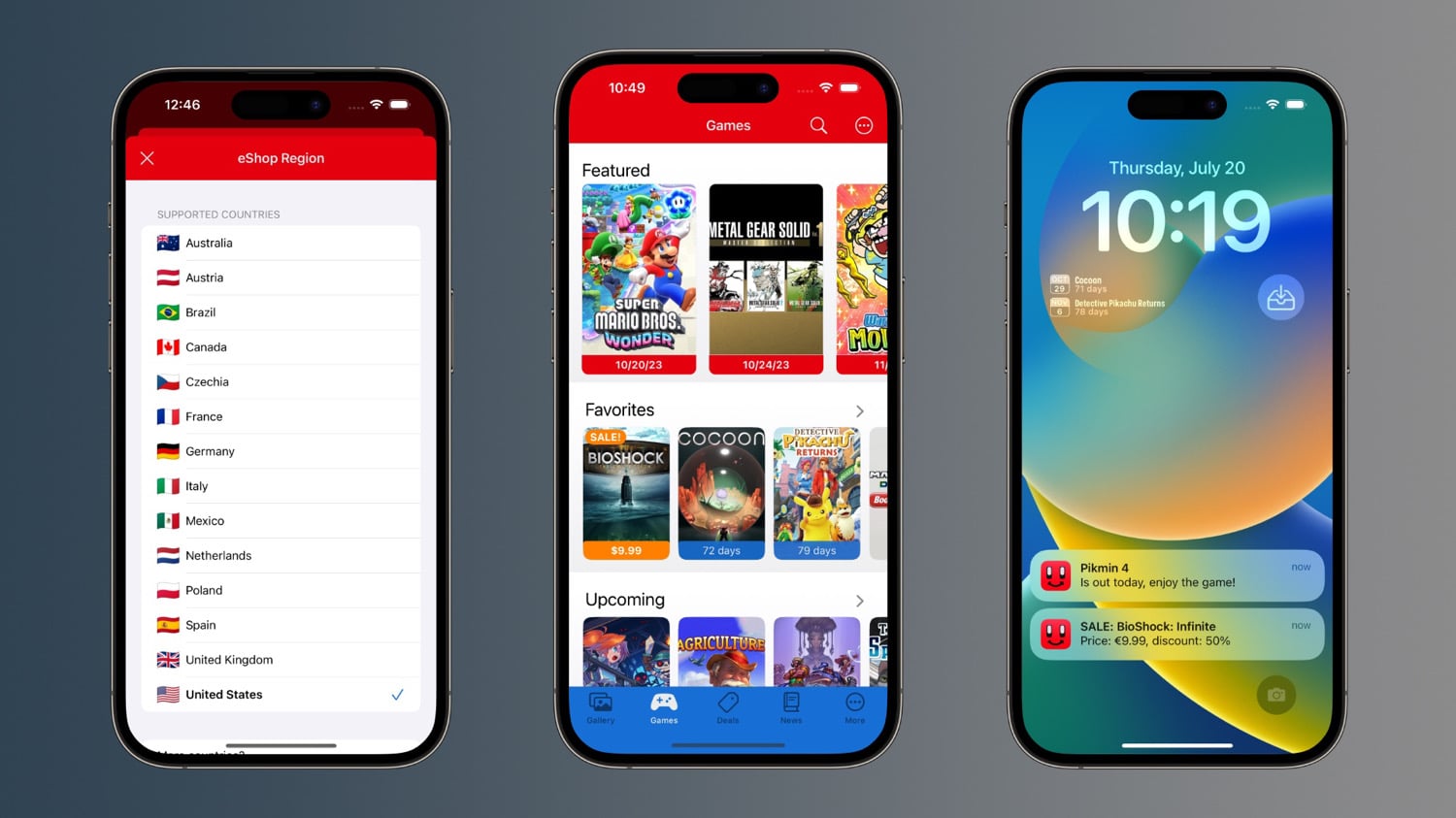 - Benachrichtigungen: Mit Version 3.4.0 kann die App Spiele auf der Wunschliste im Hintergrund überwachen und Benachrichtigungen senden, wenn der Verkauf im Nintendo eShop startet. User können auch Benachrichtigungen für einzelne Spieleveröffentlichungen aktivieren, um kein Spiel zu verpassen. Außerdem benachrichtigt die App, wenn ein favorisiertes Spiel ein Veröffentlichungsdatum erhält. Das ist ideal für lang erwartete Spiele, die bereits angekündigt sind.