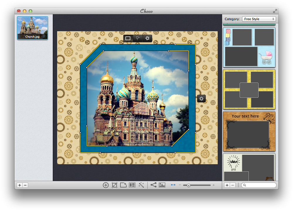 Im Mittelpunkt der deutschsprachigen Anwendung stehen neben einer einfachen Handhabung vor allem mehr als 100 integrierte Vorlagen, die man im Handumdrehen mit eigenen Bildern befüllen kann. Wer keine Zeit und Lust hat, sich intensiver mit seiner Collage zu beschäftigen, wählt in Choco 2 einfach den Shuffle-Modus aus: Hier werden die zuvor ausgewählten Bilder zufällig in einer passende Collage verfrachtet.