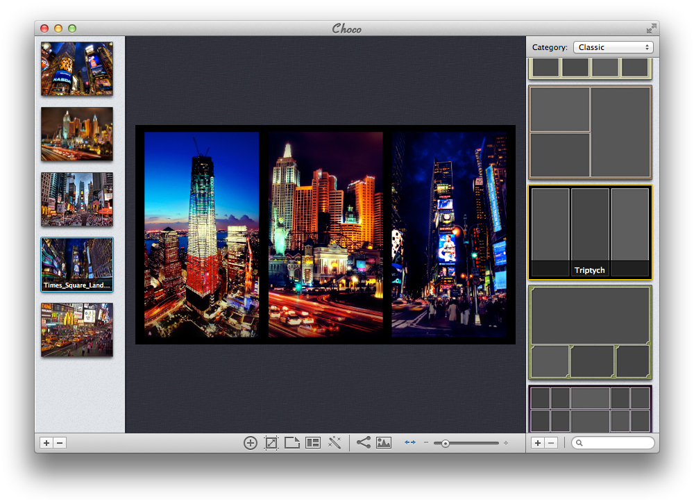 Um Collagen zu erstellen, gibt es im Mac App Store zahlreiche Apps. Choco 2 (Mac Store-Link) gehört aber ohne Zweifel zu den umfangreichsten Apps, die man sich laden kann. So ist auch der normalerweise hohe Preis von 26,99 Euro zu erklären, den man seit Juli 2013 durchgängig bezahlen musste. Zuvor gab es eine Preisaktion, während der man Choco 2 für 4,49 Euro kaufen konnte, aktuell ist der Preis sogar auf 1,79 Euro gefallen.