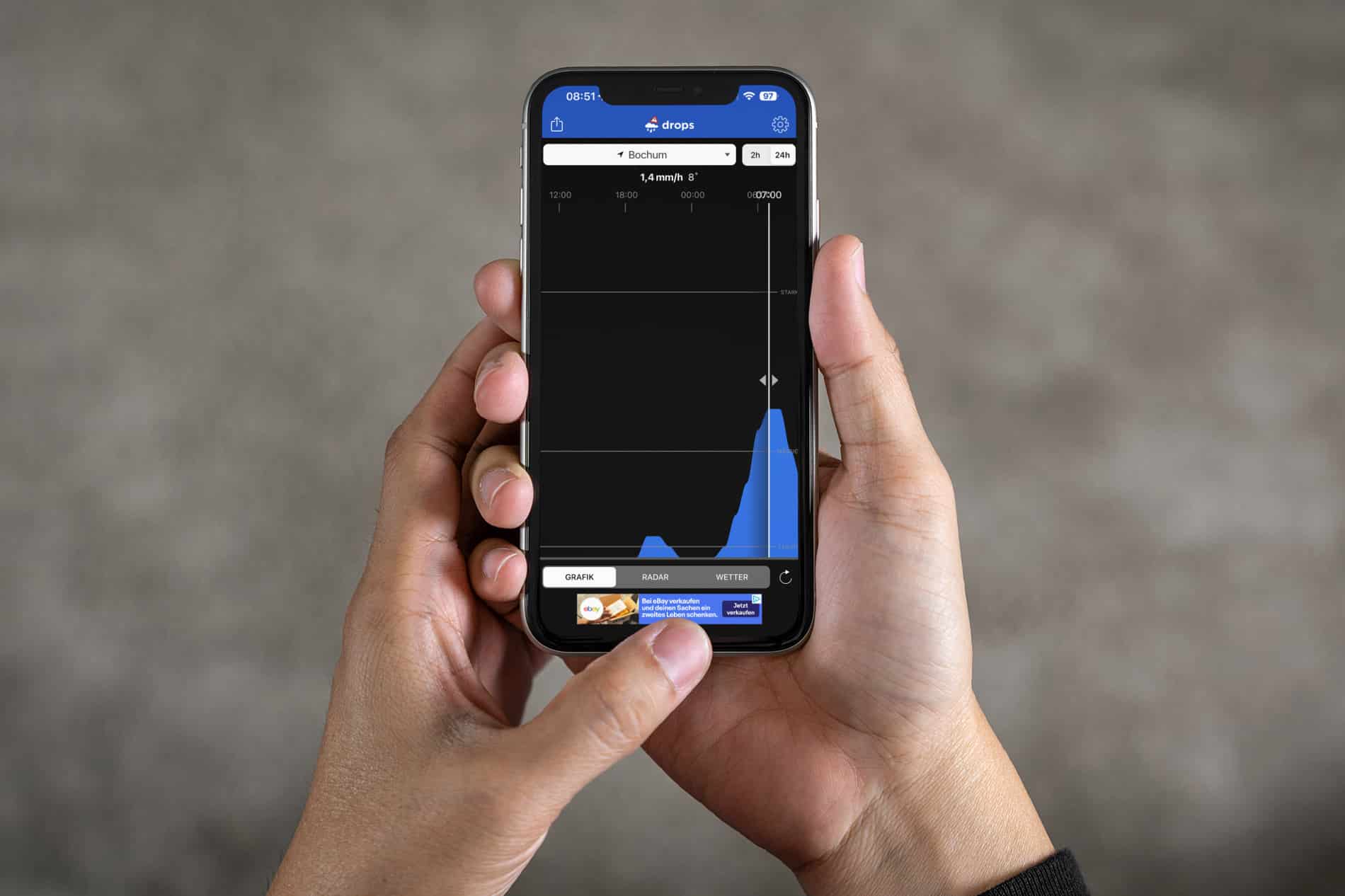 Mit der App Drops (App Store-Link) könnt ihr auf ein Niederschlagsradar zugreifen – gerade in den Sommermonaten, in denen häufig Schauer und Gewitter übers Land ziehen, eine gute Idee. Die Anwendung fürs iPhone, iPad und die Apple Watch lässt sich kostenlos aus dem deutschen App Store herunterladen und benötigt neben 76 MB an freiem Speicherplatz auch mindestens iOS bzw. iPadOS 14.0 oder neuer. Auch an eine deutsche Lokalisierung wurde von Seiten des Entwicklerteams von Infoplaza bereits gedacht.