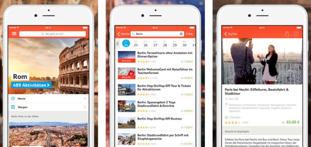 GetYourGuide (App Store-Link) ist eine kostenlose iPhone-App, die derzeit auch von Apple prominent in der Bannerrotation im Header des App Stores als „Unser Tipp“ beworben wird. Die Anwendung ist etwa 23 MB groß und benötigt zudem iOS 8.0 oder neuer auf dem zu installierenden Gerät. Alle Inhalte stehen bereits in deutscher Sprache zur Verfügung.