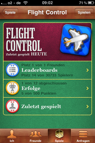 Eines der Spiele, die auf meinem iPhone schon mit Game Center funktionieren, ist Flight Control. Das erfolgreiche Casual-Game zeigt unter anderem Leaderboards, Erfolge und die letzten Spiele an, außerdem kann es direkt aus dem Game Center heraus gestartet werden.