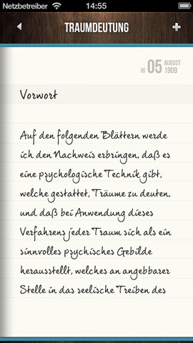 Schön animiert öffnet sich dann das jeweilige Notizbuch, und man trägt über die Tastatur des iDevices seine Gedanken, Listen oder sonstige geistige Ergüsse ein. Dabei stehen zehn verschiedene Schriftarten in unterschiedlichen Farben und Größen bereit. Auch der Stil des Papiers kann aus verschiedenen Varianten ausgewählt werden. Realistische Umblätter-Animationen und ein Inhaltsverzeichnis runden die App ab.