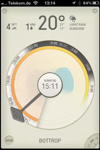 Mit dem ersten Update, das vor wenigen Tagen veröffentlicht wurde, bekommt die Applikation eine deutsche Lokalisierung, so dass alle Elemente und Darstellungen in deutscher Sprache vorliegen. In der grafischen Anzeige findet man die aktuelle Temperatur, die Höchst- und Tiefst-Temperatur des Tages, die Windgeschwindigkeit und die Niederschlagswahrscheinlichkeit.