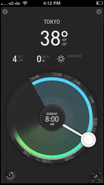 Das Pendel kann man im Kreis bewegen, wobei man immer in der Uhrzeit vorrückt und die Daten automatisch aktualisiert werden. Zusätzlich gibt es im inneren Kreis eine Anzeige, die farblich zwischen orange, gelb und blau unterscheidet und somit die Temperatur farblich darstellt. Zusätzlich befindet sich im Kreisinnern ein ebenfalls bläulicher Kreis, der den Niederschlag darstellt. Die Grafik liefert auf einen Blick alle relevanten Daten, die man sich für eine Wettervorhersage wünscht.