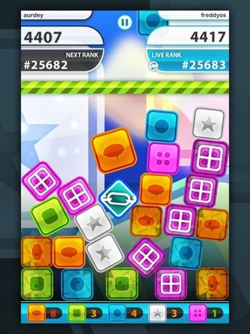 Durch eine roten Linie wird das Display in zwei Hälften geteilt. Wenn das Spielfeld so voll ist, das nachfallende Blöcke die rote Linie überschreiten ist das Spiel beendet und der Highscore wird im Game Center eingetragen. Um allerdings wieder freien Platz zu schaffen, muss man Blöcke der gleichen Farbe antippen, mit einem weiteren Klick werden sie aufgelöst und die Punkte dem eigenen Konto gutgeschrieben.