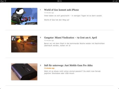 Schnell wird klar, dass das Programm nicht viel mehr ist als ein wenig flexibler RSS-Reader ist. Aus der linken Leiste kann man Meldungen wählen, rechts wird dann die Webseite angezeigt. Besonders ärgerlich ist, dass man die linke Leiste nicht ausblenden kann – vor allem im Portrait-Modus.