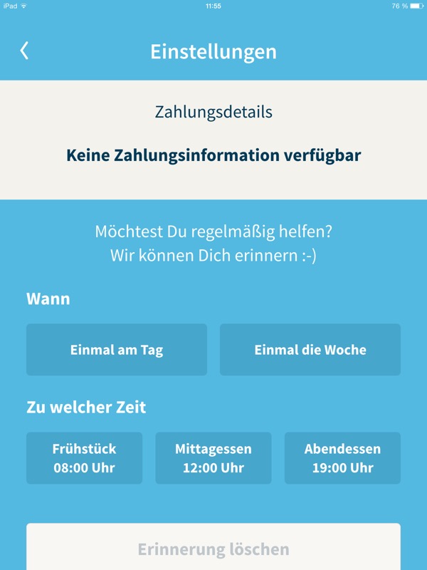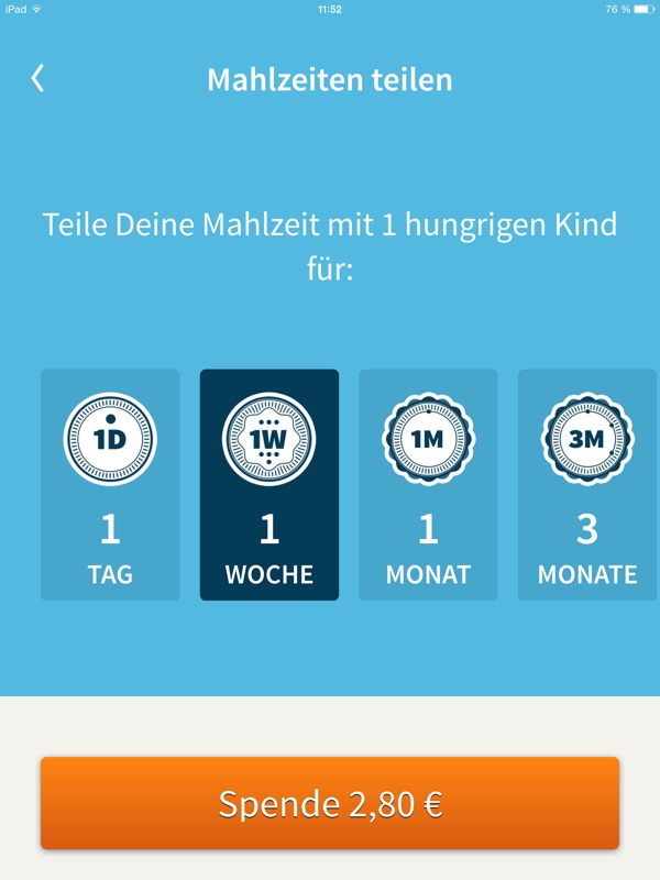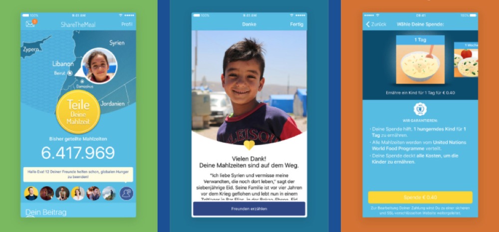 appgefahren iPhone-App der Woche – ShareTheMeal: Mit zwei einfachen Klicks innerhalb der App kann eine Mahlzeit geteilt werden – diese Spende von 40 Cent ernährt ein hungerndes Kind einen ganzen Tag lang. Die Mahlzeiten werden vom UNO-Welternährungsprogramm an die Kinder verteilt. Zudem kann eingesehen werden, in welcher Region Lesothos das Programm gerade aktiv ist, und wie viele Kinder dort noch ernährt werden müssen. Eine Leiste zeigt den bisherigen Erfolg an – aktuell sind es für den Bezirk Mokhotlong in Lesotho bereits 401 von 1540 ernährte Kinder. Auch das Gesamtziel, nämlich alle bedürftigen Schulkinder für ein ganzes Jahr zu ernähren, kann verfolgt werden: Bislang wurde 1% von notwendigen 100% erreicht. (Universal, kostenlos)