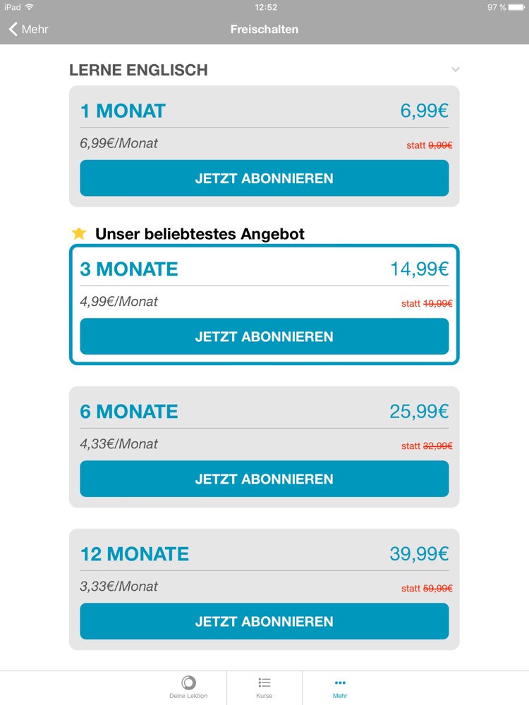 Neben dem Englisch A1/A2-Kurs kann man sich auch in einem gleichwertigen Spanisch-Kurs versuchen – für jede Box werden auf der Website des Verlags 189 Euro fällig – auch bei Amazon halten sich die Preise für die Boxen auf einem gleichen Preisniveau (Englisch/Spanisch). Ab Juni 2013 will Langenscheidt dann weitere A1/A2-Kurse in Französisch, Italienisch und Schwedisch folgen lassen.