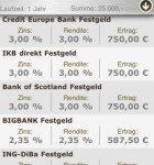 Über einen Schieberegler am oberen Bildschirmrand kann man die Laufzeit bestimmen, direkt darunter wird eine ungefähre Anlagesumme festgelegt. Eine genaue Summe kann man über die beiden Menüpunkte “Tagesgeld” und “Festgeld” eingeben. Nur einen Klick später bekommt man die verschiedenen Anbieter angezeigt.
